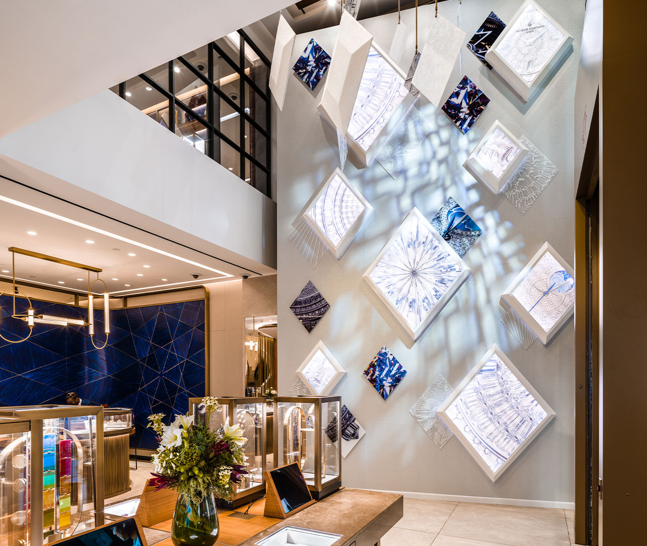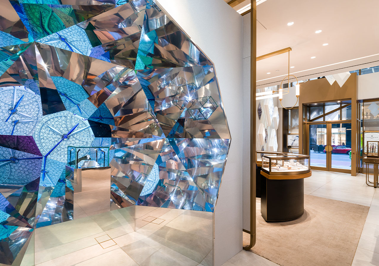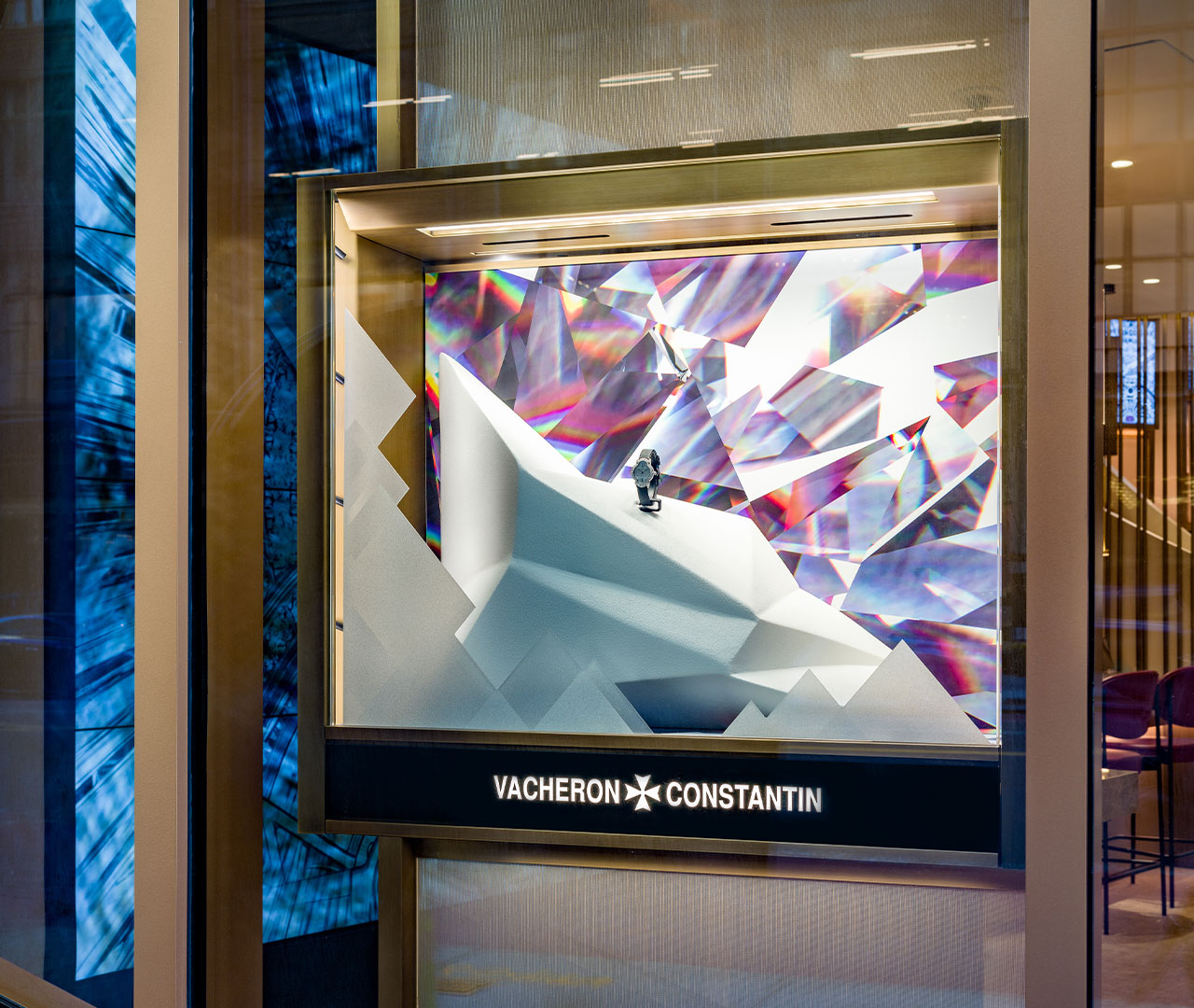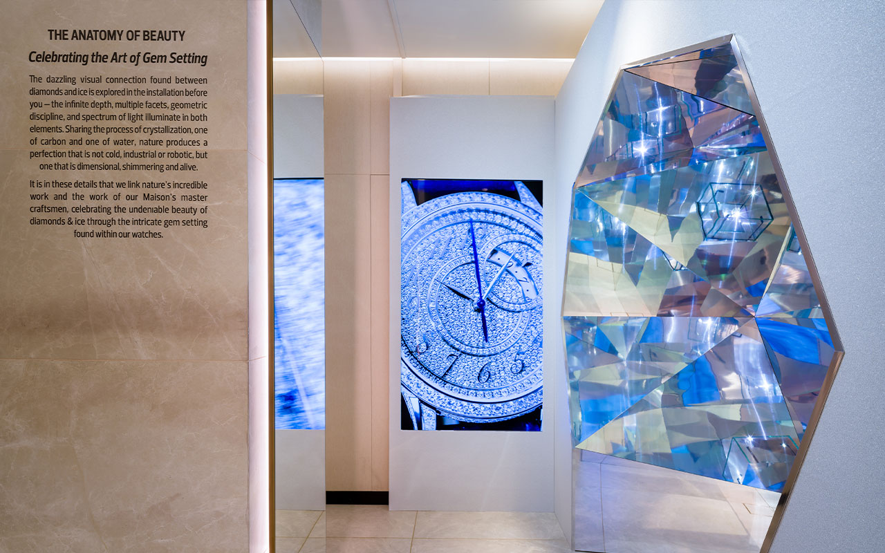 Working with David Stark Design and Pink Sparrow, we designed Vacheron Constantin’s 2022 winter retail store design in New York to feature their renowned expertise in diamond setting. We created an animated light wall and facade to showcase images of their products, displayed watches on icebergs in their windows, hung a graphic “chandelier” of patterned diamonds from the ceiling, and created a walk-in kaleidoscope room to immerse visitors inside a diamond.