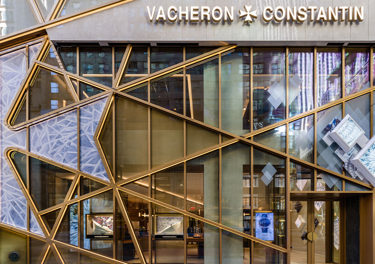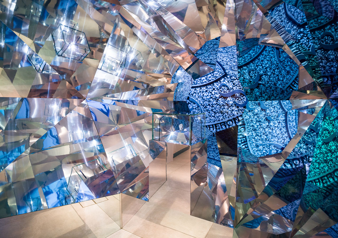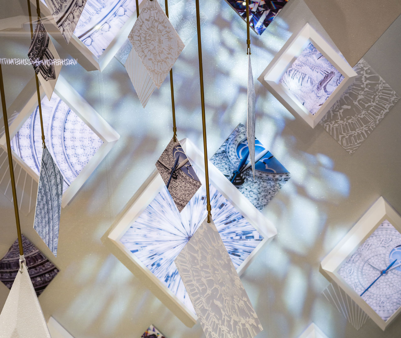 Working with David Stark Design and Pink Sparrow, we designed Vacheron Constantin’s 2022 winter retail store design in New York to feature their renowned expertise in diamond setting. We created an animated light wall and facade to showcase images of their products, displayed watches on icebergs in their windows, hung a graphic “chandelier” of patterned diamonds from the ceiling, and created a walk-in kaleidoscope room to immerse visitors inside a diamond.